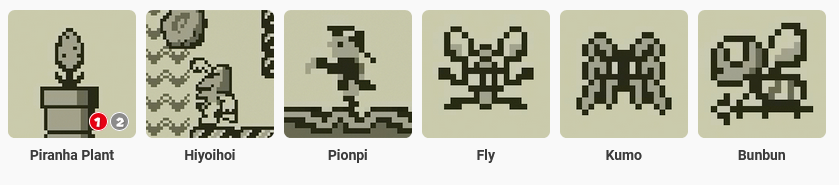 A bee that flies through the air and drops arrows downwards. It appears in Mario Land 1-2. You can defeat them by jumping and stepping on their heads. If you are on a high place, ignore the bees and dodge their arrows.