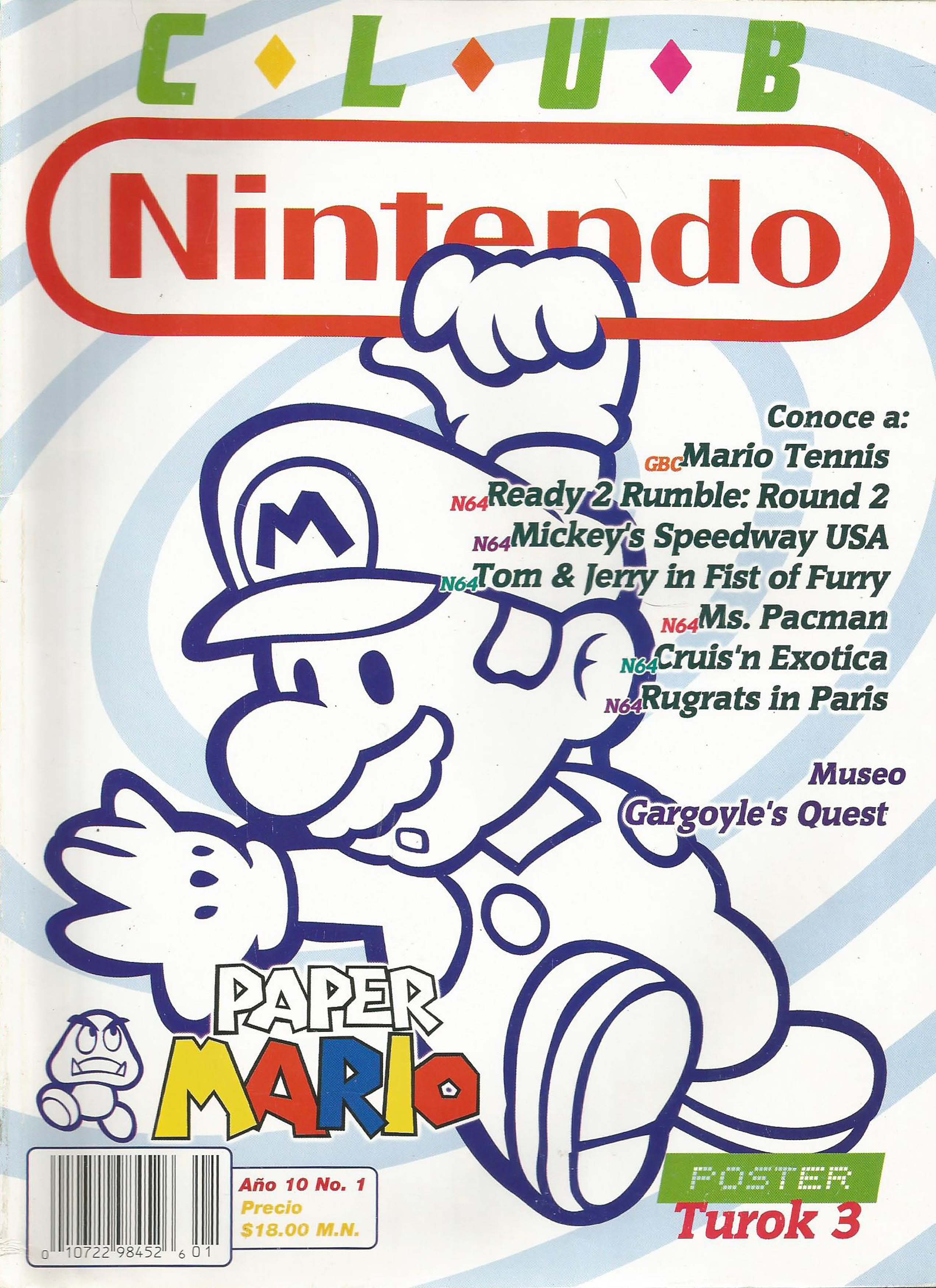 - On the January 2001 edition's cover (Year 10, Issue no. 1), Mario appears with his look from Paper Mario with the same appearance and pose as his artwork on the game's case cover, except it is mirrored and in blue line art, and his hand is held horizontally onto the Nintendo logo instead of vertically onto Parakarry's hand.