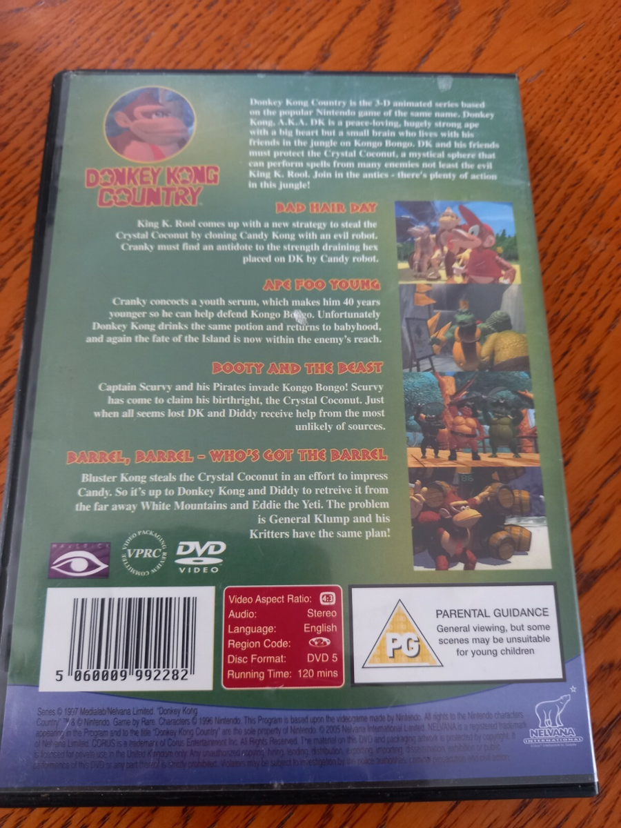 Donkey Kong Country is the 3-D animated series based on the popular Nintendo game of the same name. Donkey Kong, A.K.A. DK is a peace-loving, hugely strong ape with a big heart but a small brain who lives with his friends in the jungle on Kongo Bongo. DK and his friends must protect the Crystal Coconut, a mystical sphere that can perform spells from many enemies not least the evil King K. Rool. Join in the antics - there's plenty of action in this jungle!