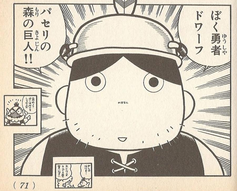 Dwarf is the brave giant of Parsley Woods, who appears in the last chapters of Super Mario Land 3: Wario Land 3 in the Super Mario Kodansha manga. He is a giant dress like a typical medieval woodcutter, with the addition of a cooking pot for a hat, adorned with a feather. He has a five o'clock shadow beard and a tiny pencil mustache that is actually made of a word revealing his current emotion, which cannot be deciphered with his big eyes and tiny mouth.