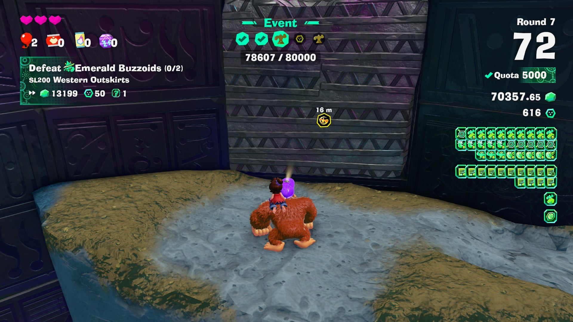 Every run spans a number of rounds, each with a given emerald quota to fill within a time limit of 99 seconds. Halfway through the first round, Void Kong begins issuing Void Goals that award the player bonus emeralds and Emerald Chips upon completion. Breaking a fossil, finding a new skill in a Banandium Gem, or completing a Void Goal grants the player an opportunity to unlock one of three random Emerald Perks, which affect the player's skills, actions, and achievements in various ways; for instance, certain Perks multiply the number of emeralds earned when the player defeats enemies or destroys terrain while wielding a chunk or wearing a specific Bananza transformation. Initially, every possible source of emeralds, whether bullion, enemies, or destructible terrain, yields as much emerald as it would normally yield gold, but this amount can increase dramatically the more Perks the player has accumulated. Multipliers earned from Perks can stack depending on what those Perks act upon.