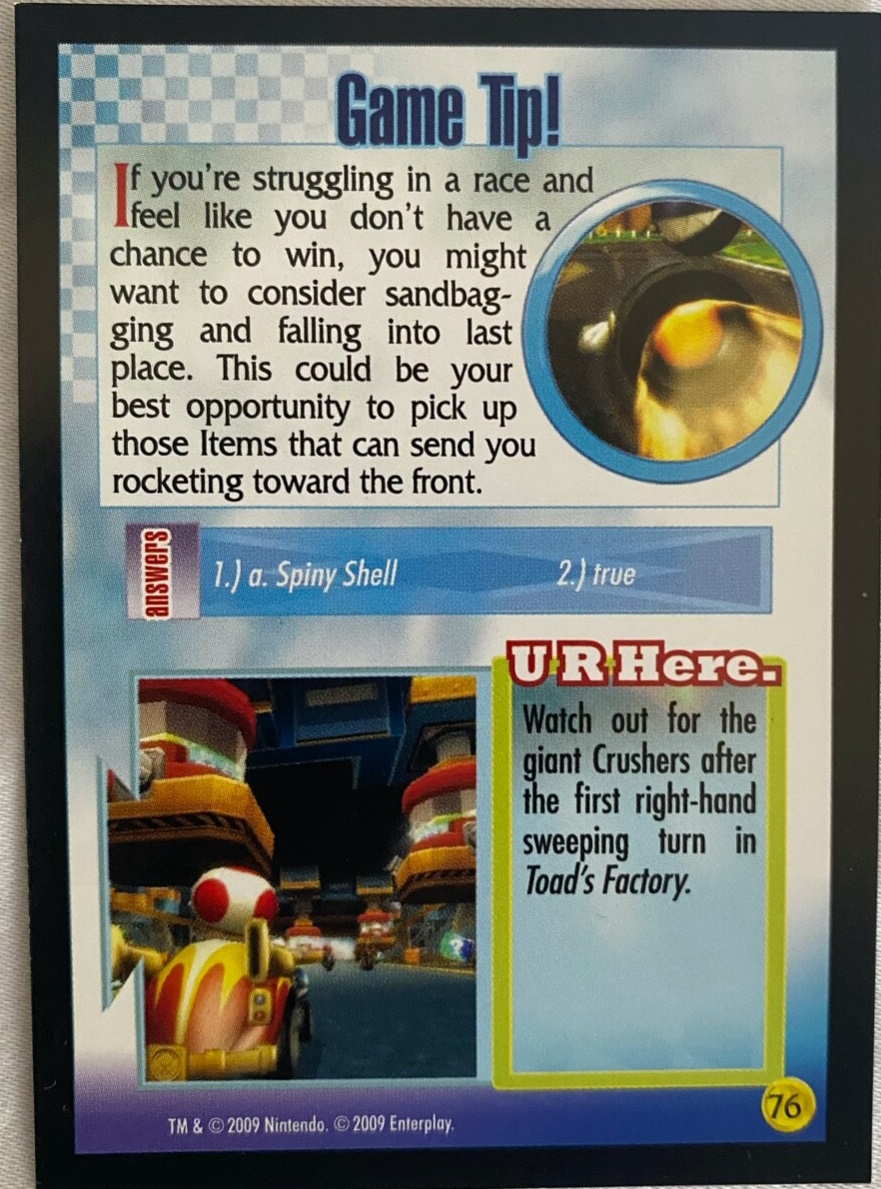 Description | The "A Fall-Behind Strategy" card (Back) from the Mario Kart Wii trading cards |