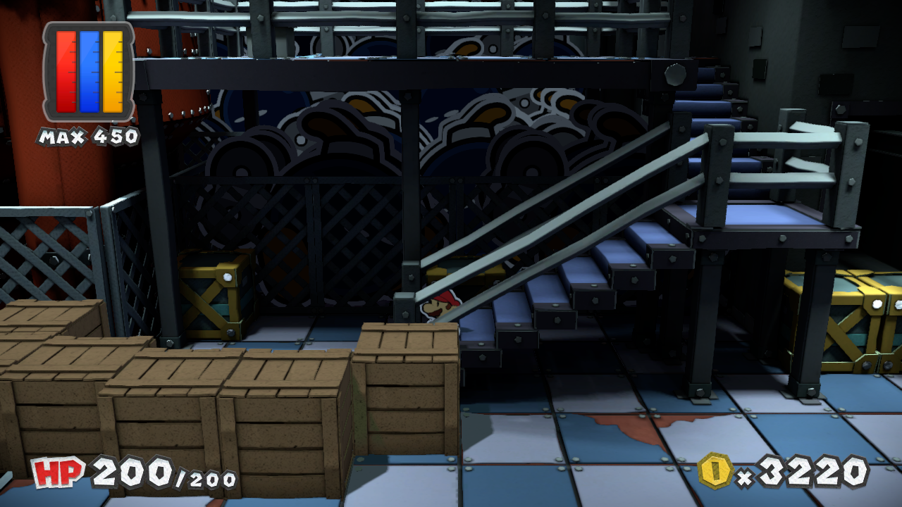 | Description | Mario near 7 crates containing Battle Cards in Black Bowser's Castle of Paper Mario: Color Splash. The first three contain 1-Up Mushroom, Huge Hammer and Huge Jump. |