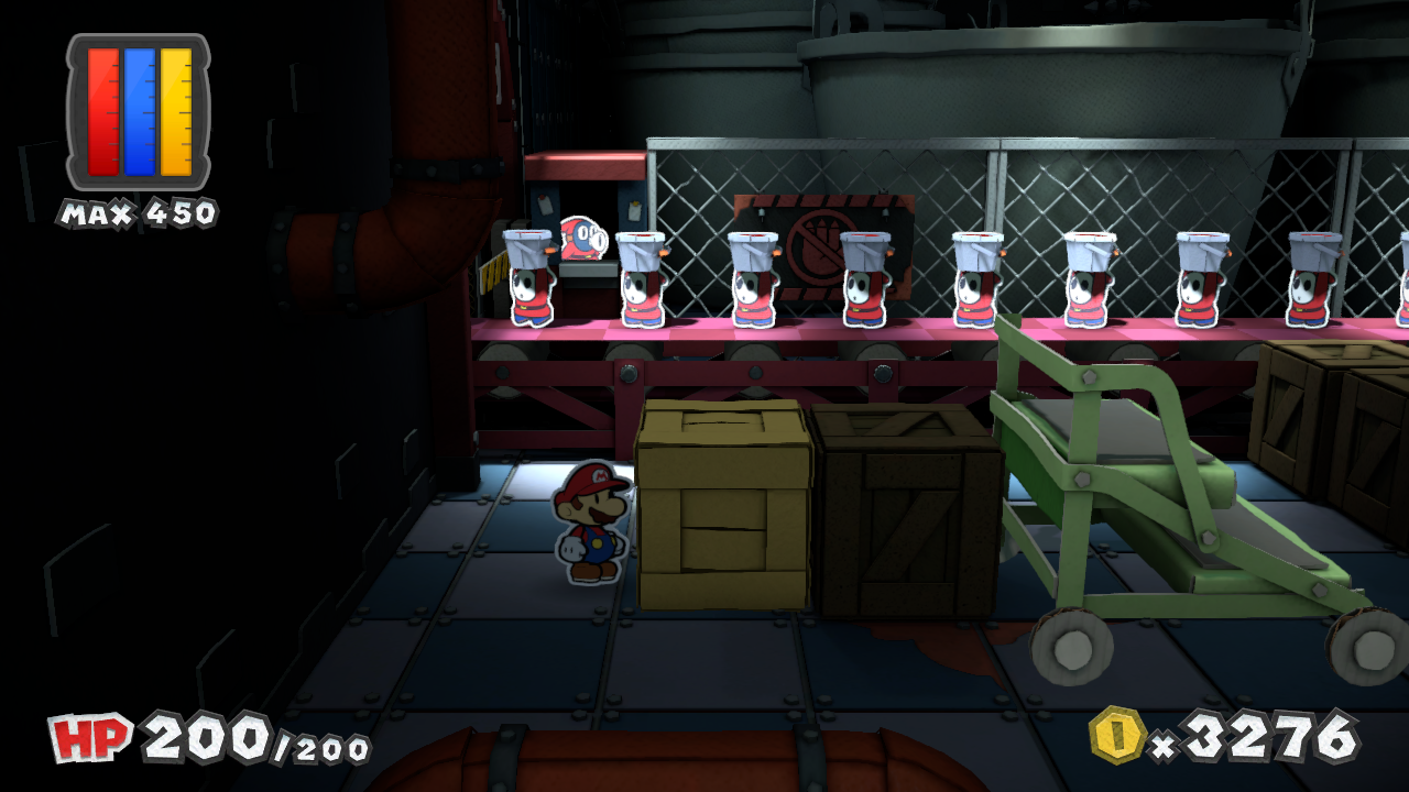 | Description | Mario near a crate containing Big Fire Flower and Huge Hammer Battle Cards in Black Bowser's Castle of Paper Mario: Color Splash. |