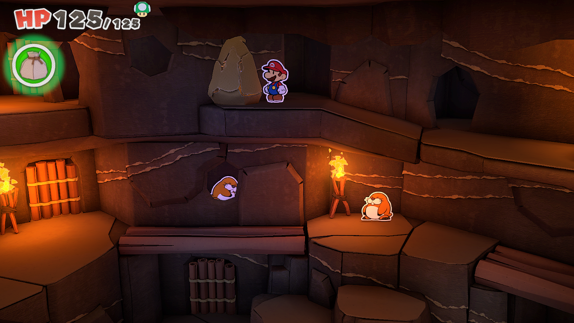 | Description | Mario standing near a rock containing a Monty mole who gives Mario a 100-Coin in Breezy Tunnel of The Origami King. |