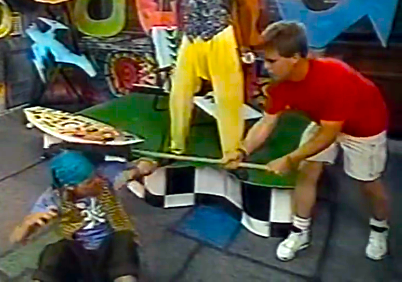 Description | Joseph Bridgers (right) hitting Tommy Treehugger (left) with his shark fin pole in the Club Mario segment for The Super Mario Bros. Super Show! episode "Pirates of Koopa" |