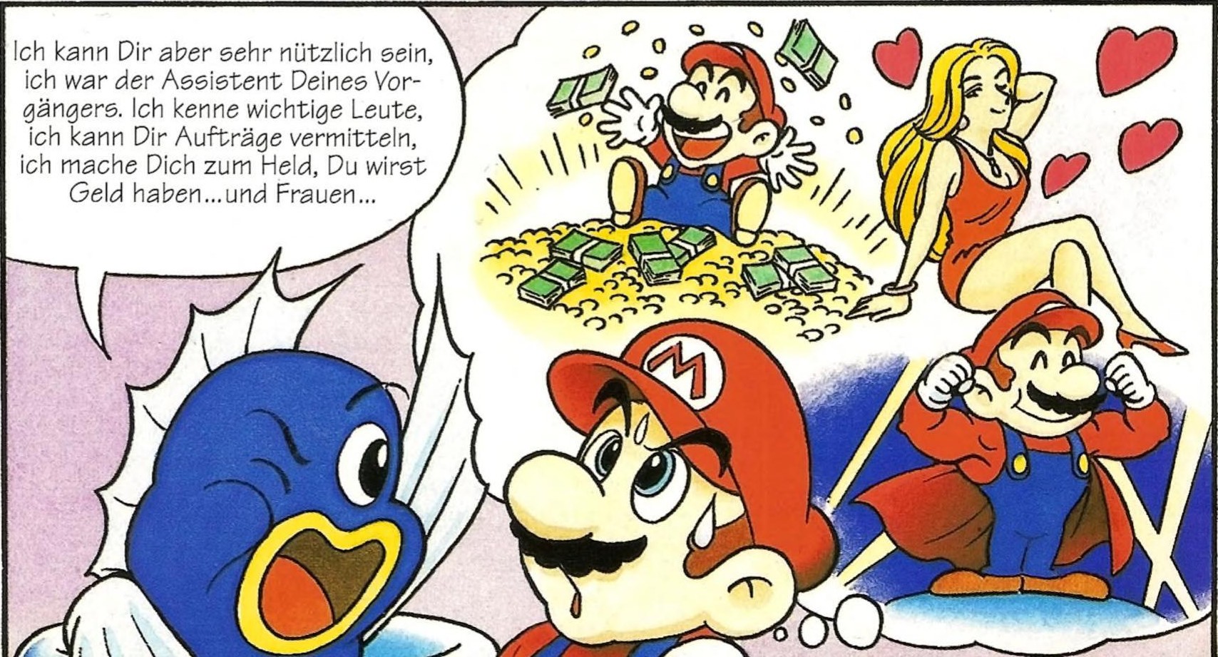 | Description | The Blaufisch with Mario in the Club Nintendo comic "Das Vermächtnis des Dr. Lichtblitz" |