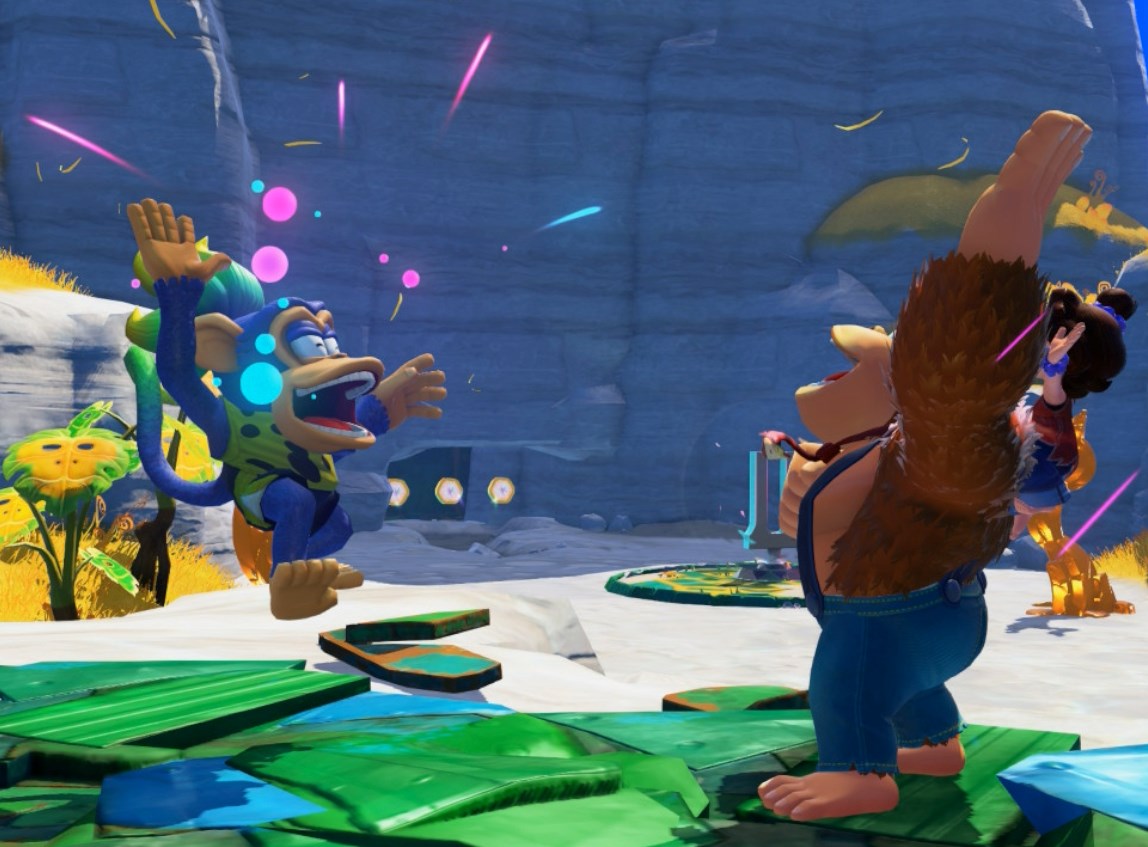 | Description | A screenshot of Donkey Kong Bananza in which Donkey Kong and Pauline give a Salvager Monkey a High-five. |