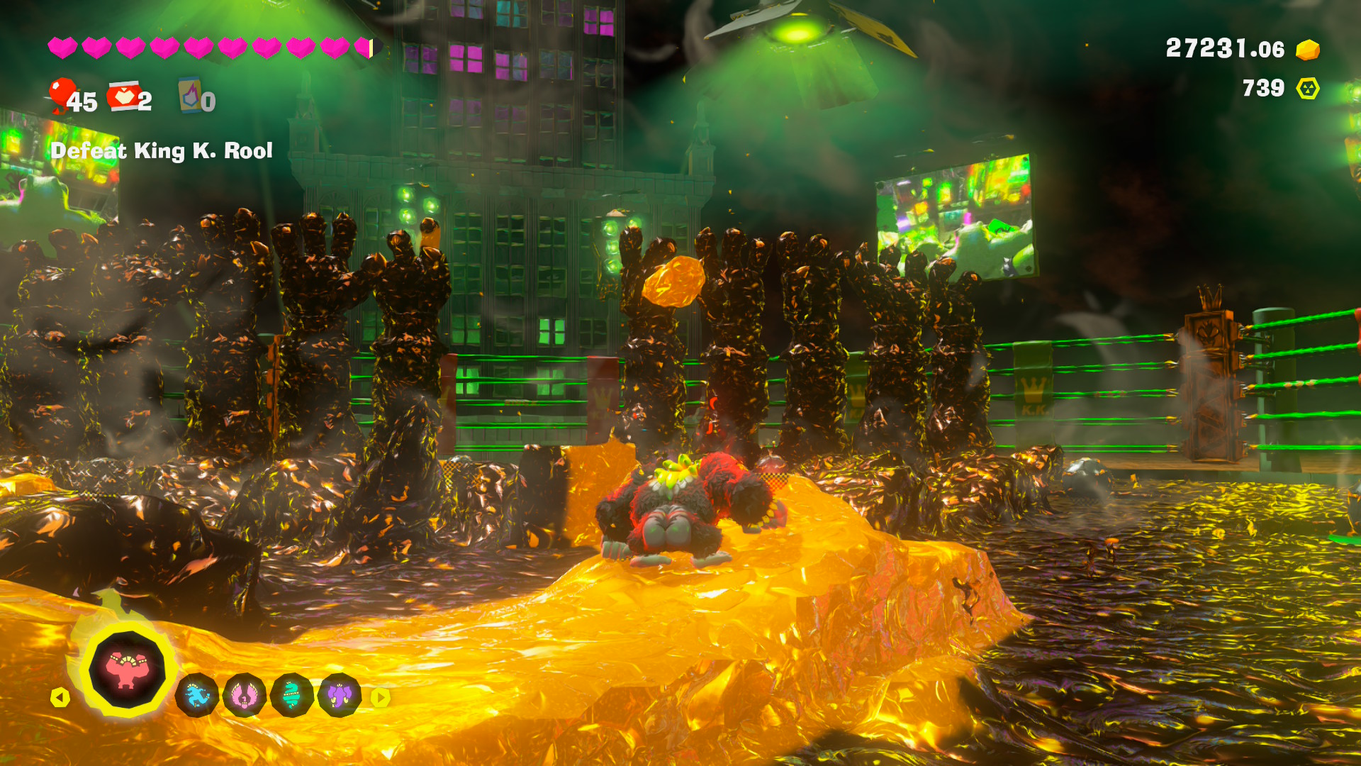 | current | 09:31, October 7, 2025 | 1,920 × 1,080 (663 KB) | CyonOfGaia (talk | contribs) | {{aboutfile |1=In-game screenshot of the final boss fight with K. Rool, King of Rot in ''Donkey Kong Bananza'' |2=Self-capture (Nintendo Switch 2 screenshot, sent via the Nintendo Switch App) }} Category:Donkey Kong Bananza screenshots == Licensing == {{game-screenshot}} |