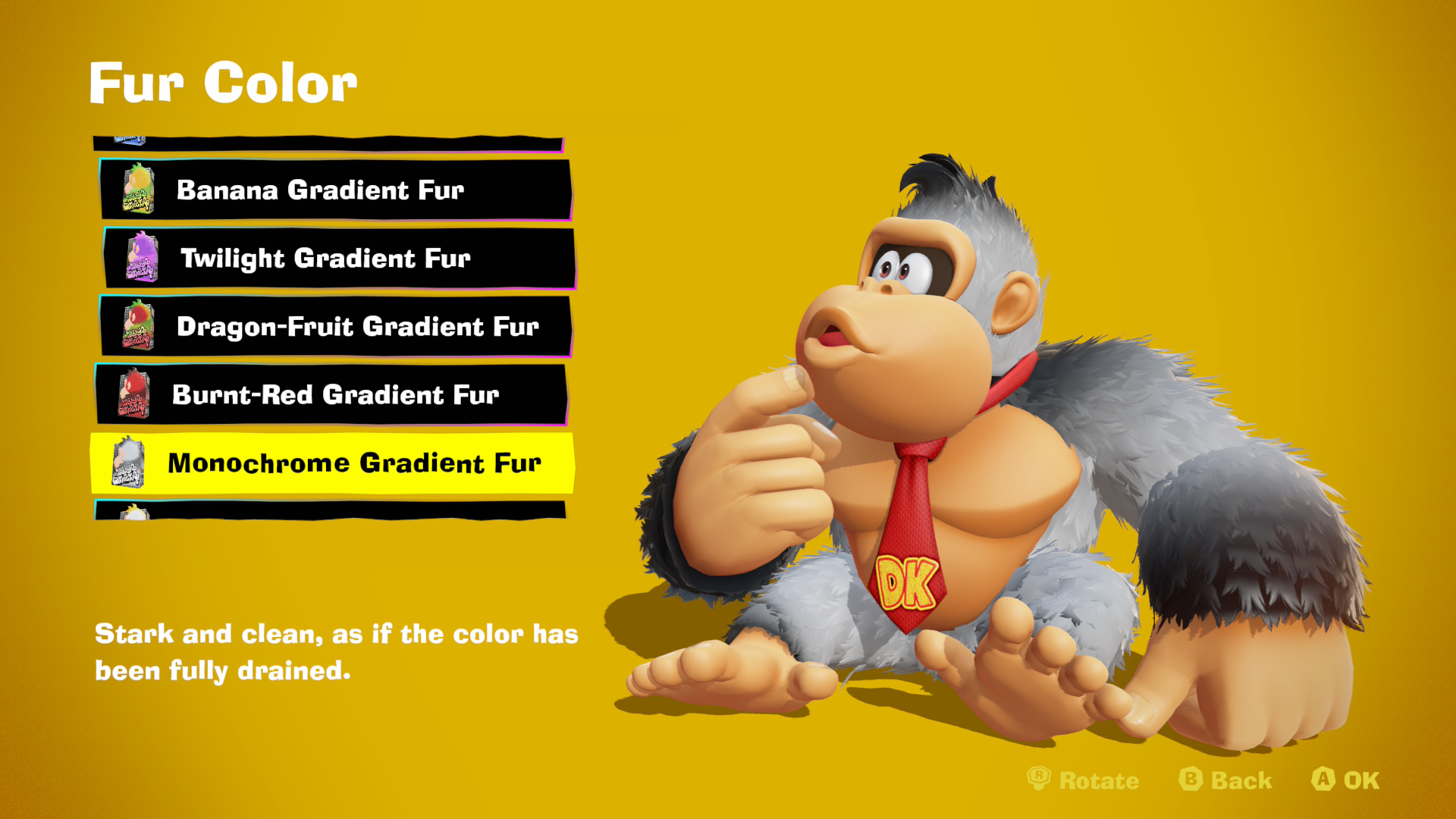 | current | 16:31, August 18, 2025 | 1,920 × 1,080 (1.31 MB) | TomZhao (talk | contribs) | {{aboutfile |1=Monochrome Gradient Fur |2=''Donkey Kong Bananza'' |3=Nintendo }} == Licensing == {{game-screenshot}} Category:Donkey Kong Bananza screenshots |