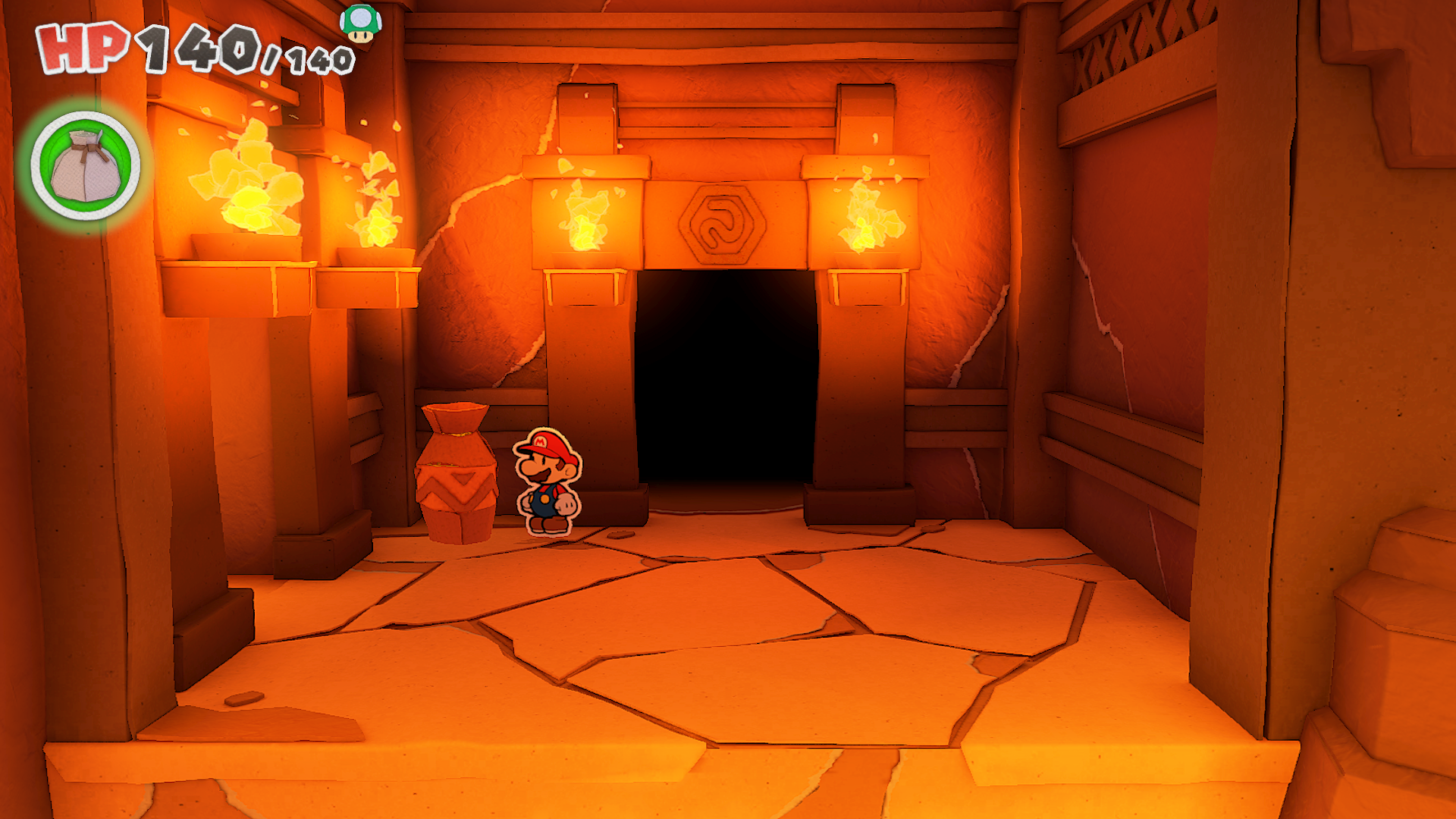 | Description | Mario standing near a vase containing a Big Bag of Confetti in Fire Vellumental Cave of The Origami King. |