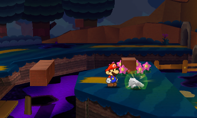 | Description | Mario near crumpled up Tree Stump scrap in Loop Loop River of Paper Mario: Sticker Star. |