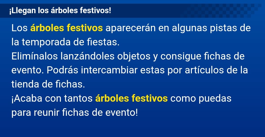 | current | 20:39, December 22, 2025 | 1,080 × 562 (122 KB) | Koopa con Carne (talk | contribs) | {{aboutfile |Screenshot of a section of the «¡Dos temporadas consecutivas! ¡Llega la alegría festiva!» in-game notification. The text shown in the screenshot reads:<blockquote>'''¡Llegan los árboles festivos!'''<br>Los árboles festivos aparecerán en algunas pistas de la temporada de fiestas.<br>Elimínalos lanzándoles objetos y consigue fichas de evento. Podrás intercambiar estas por artículos de la tienda de fichas.<br>¡Acaba con tantos árboles festivos como puedas para reunir fichas de event... |