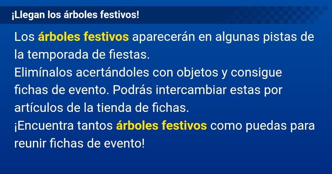 | current | 20:42, December 22, 2025 | 1,080 × 566 (123 KB) | Koopa con Carne (talk | contribs) | {{aboutfile |Screenshot of a section of the «¡Dos temporadas consecutivas! ¡Llega la campaña festiva!» in-game notification. The text shown in the screenshot reads:<blockquote>'''¡Llegan los árboles festivos!'''<br>Los árboles festivos aparecerán en algunas pistas de la temporada de fiestas.<br>Elimínalos acertándoles con objetos y consigue fichas de evento. Podrás intercambiar estas por artículos de la tienda de fichas.<br>¡Encuentra tantos árboles festivos como puedas para reunir fichas de... |
