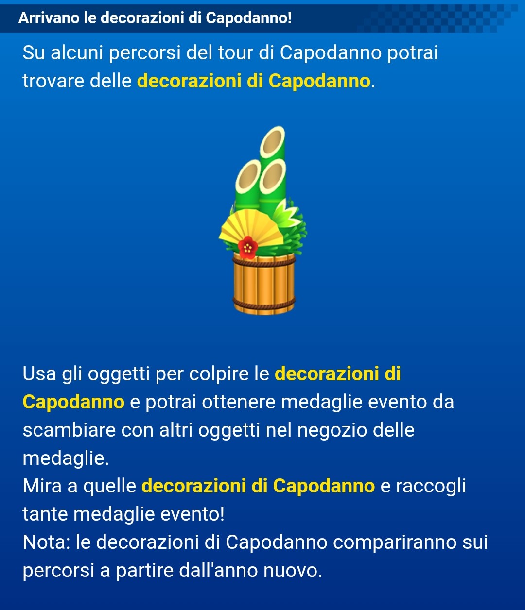 | current | 23:34, January 15, 2026 | 1,080 × 1,256 (197 KB) | Koopa con Carne (talk | contribs) | {{aboutfile |Screenshot of a section of the «I festeggiamenti per l'evento sotto l'albero terminano alla fine di questo tour! Ma l'anno nuovo ci riserva tante sorprese!» in-game notification issued December 24, 2025. The text shown in the screenshot reads:<blockquote>'''Arrivano le decorazioni di Capodanno!'''<br>Su alcuni percorsi del tour di Capodanno potrai trovare delle decorazioni di Capodanno.<br>Usa gli oggetti per colpire le decorazioni di Capodanno e potrai ottenere medaglie evento d... |