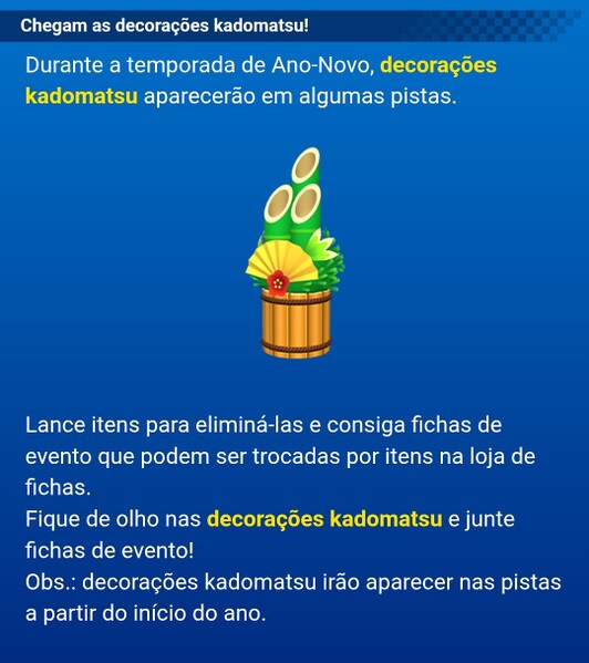 | current | 23:34, January 15, 2026 | 1,080 × 1,217 (177 KB) | Koopa con Carne (talk | contribs) | {{aboutfile |Screenshot of a section of the "A Celebração de Fim de Ano acaba no fim desta temporada! Confira as novidades da temporada de Ano-Novo!" in-game notification issued December 24, 2025. The text shown in the screenshot reads:<blockquote>'''Chegam as decorações kadomatsu!'''<br>Durante a temporada de Ano-Novo, decorações kadomatsu aparecerão em algumas pistas.<br>Lance itens para eliminá-las e consiga fichas de evento que podem ser trocadas por itens na loja de fichas.<br>Fique de o... |
