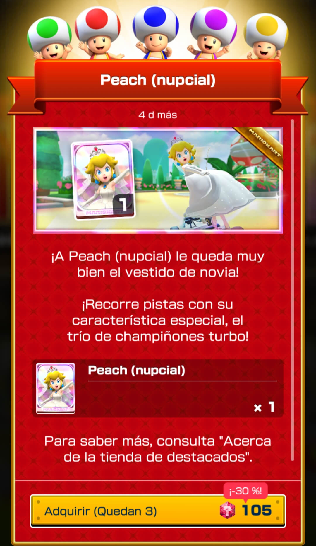 current | 14:42, May 31, 2024 | ![]() | 1,080 × 1,864 (219 KB) | Koopa con Carne (talk | contribs) | {{aboutfile|Screenshot of a special offer for Peach (Wedding) in the Spotlight Shop|''Mario Kart Tour''<br>Screenshot taken on Redmi Note 10 Pro|4=Cropped at photopea.com, then optimized with TinyPNG}} Category:Mario Kart Tour Spotlight Shop screenshots |