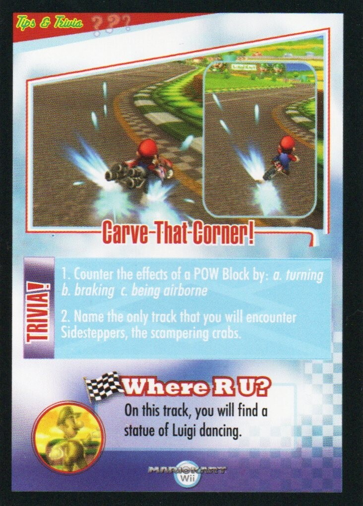 | Description | The "Carve That Corner!" card from the Mario Kart Wii trading cards |
