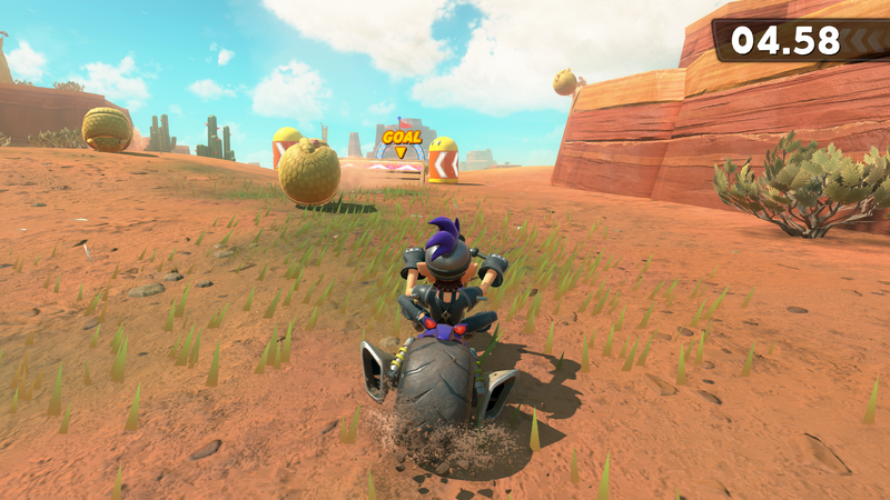 Description | An official screenshot of Waluigi doing a timed challenge and dodging armadillos in Mario Kart World. |