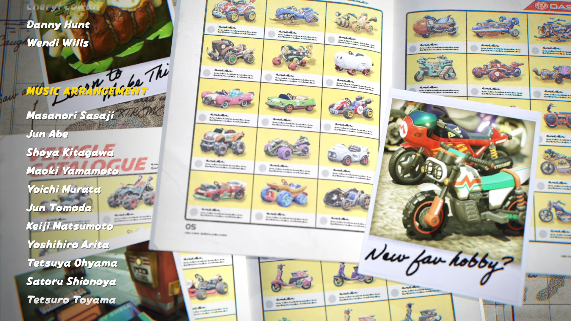 | Description | Part of the ending credits in Mario Kart World, showing vehicle catalogues from Dash that provides vehicles that are used in races. |