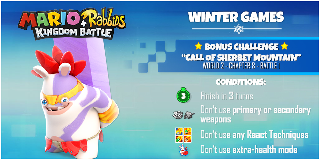 | Description | Conditions for the bonus challenge in the first season of the Mario + Rabbids Kingdom Battle Community Competition. Originally located in the Mario + Rabbids Discord server. Invite link originally posted by RabbidsOfficial (January 23, 2019). X.(Archived September 18, 2023, 11:12:31 UTC via Wayback Machine.)