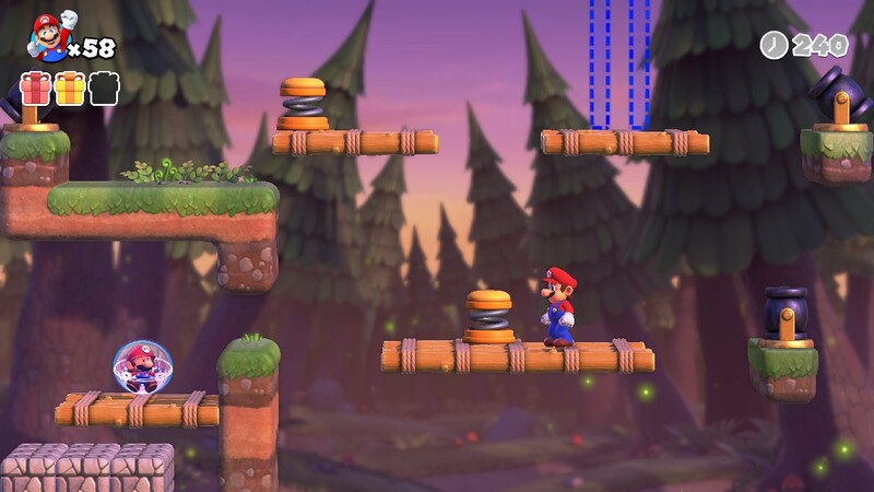 Description | Screenshot of Mystic Forest level 7-6 from the Nintendo Switch version of Mario vs. Donkey Kong |