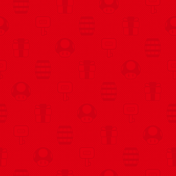 | Description | Red-colored pattern with objects that appear in Mario vs. Donkey Kong for Nintendo Switch: 1-Up Mushrooms, barrels, keys, and presents. |