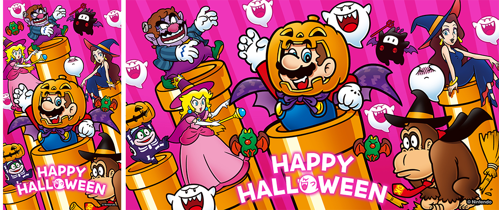 | Description | group artwork of Mario, Wario, Peach, Pauline, Donkey Kong, Spike, Boos, Ninji and Swoops in halloween forms with pipes in the background |