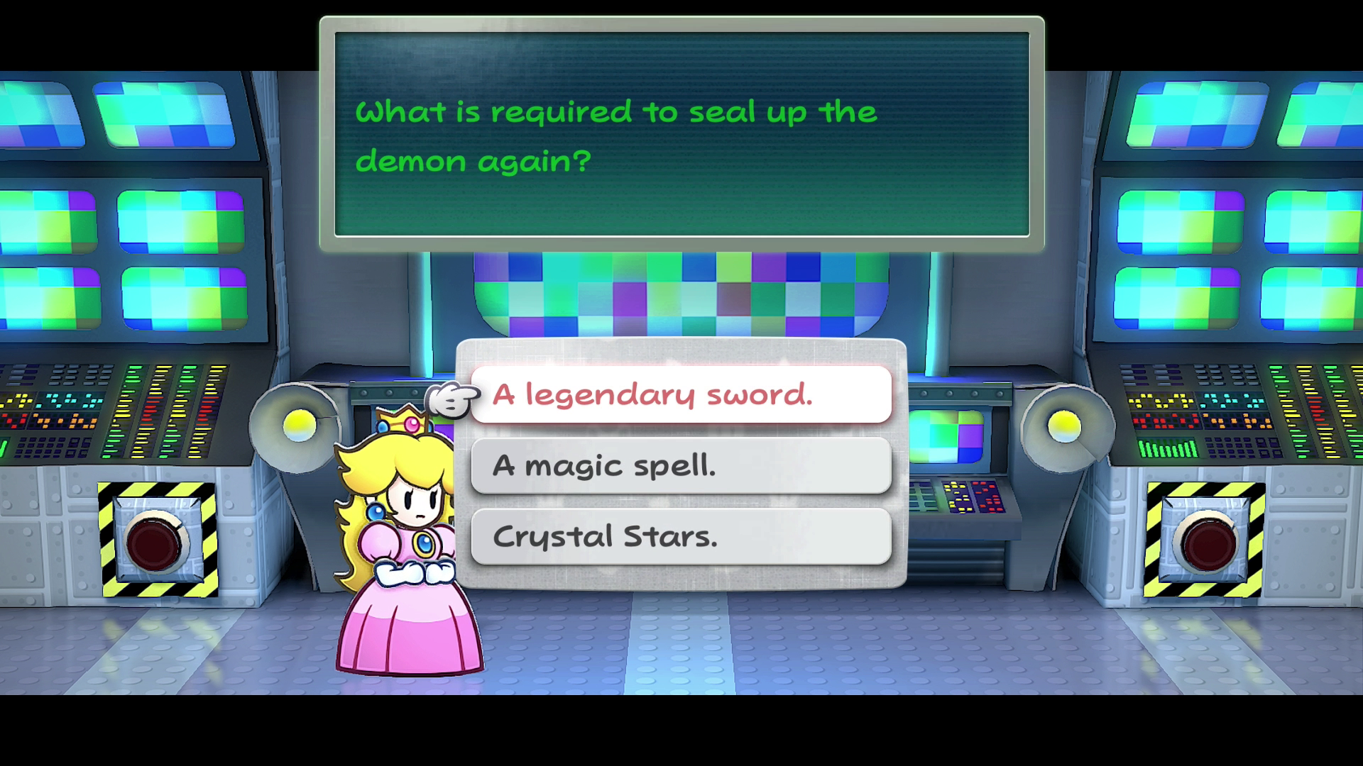 | Description | Thumbnail for "Princess Peach and TEC's Quiz" from the Nintendo Switch remake of Paper Mario: The Thousand-Year Door used for Nintendo Music. |