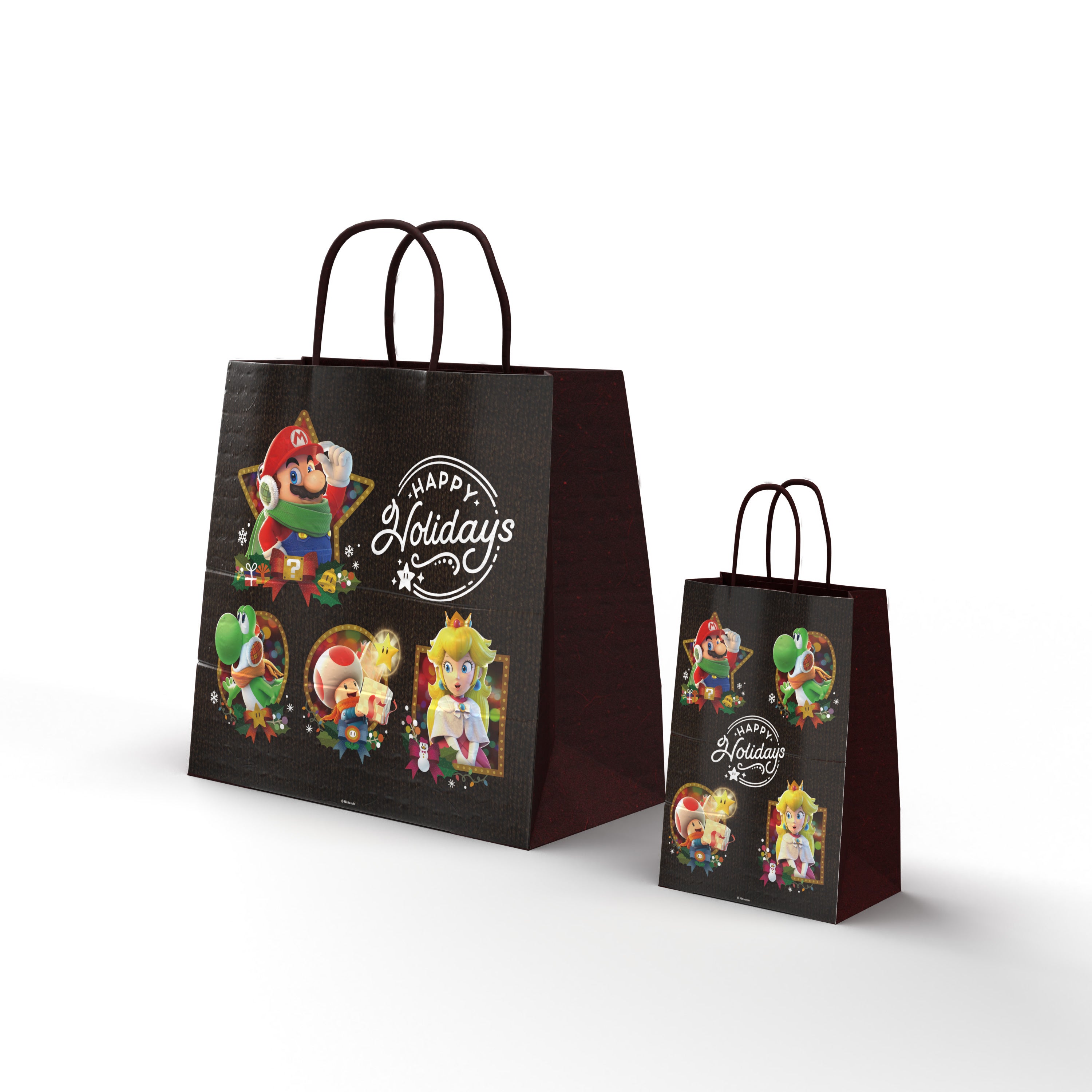 | Description | Back sides of two differently-sized Super Mario–themed paper bags featuring Mario, Yoshi, Princess Peach, and Toad in winter outfits. The bags were complimentary items received for purchasing any official Nintendo product as part of an exclusive 2021 winter event sponsored by Nintendo in Hong Kong. |