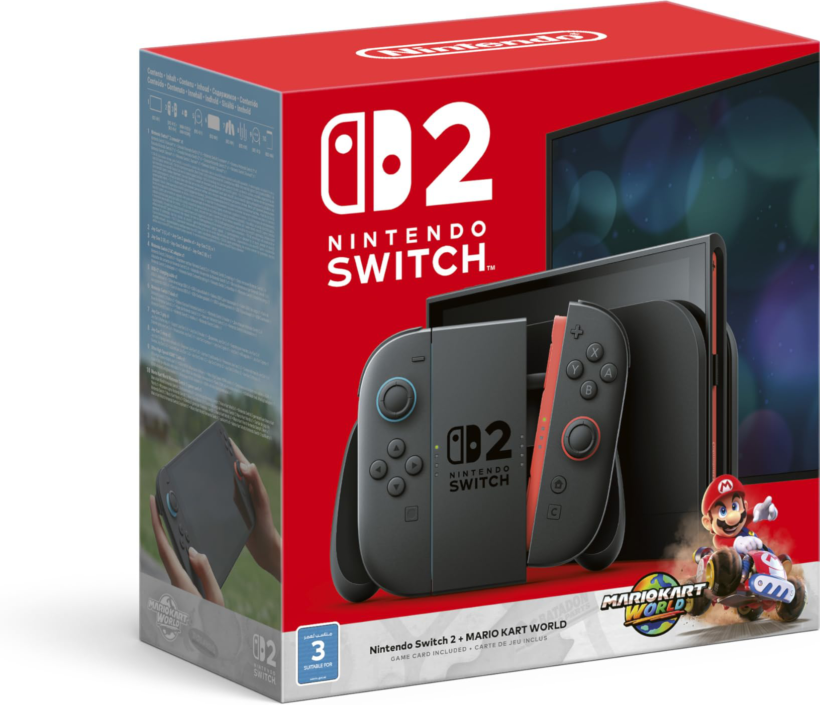 Description | Promotional artwork of the United Arab Emirates packaging for the Nintendo Switch 2 + Mario Kart World bundle, which is distributed by either Active Gulf FZCO or Jeetek Distributions DMCC specifically for the U.A.E. market. The U.A.E. bundle includes a physical copy of Mario Kart World, featuring an age rating on the cover as issued by the UAE Media Council, and the Game Card itself is a European print. |