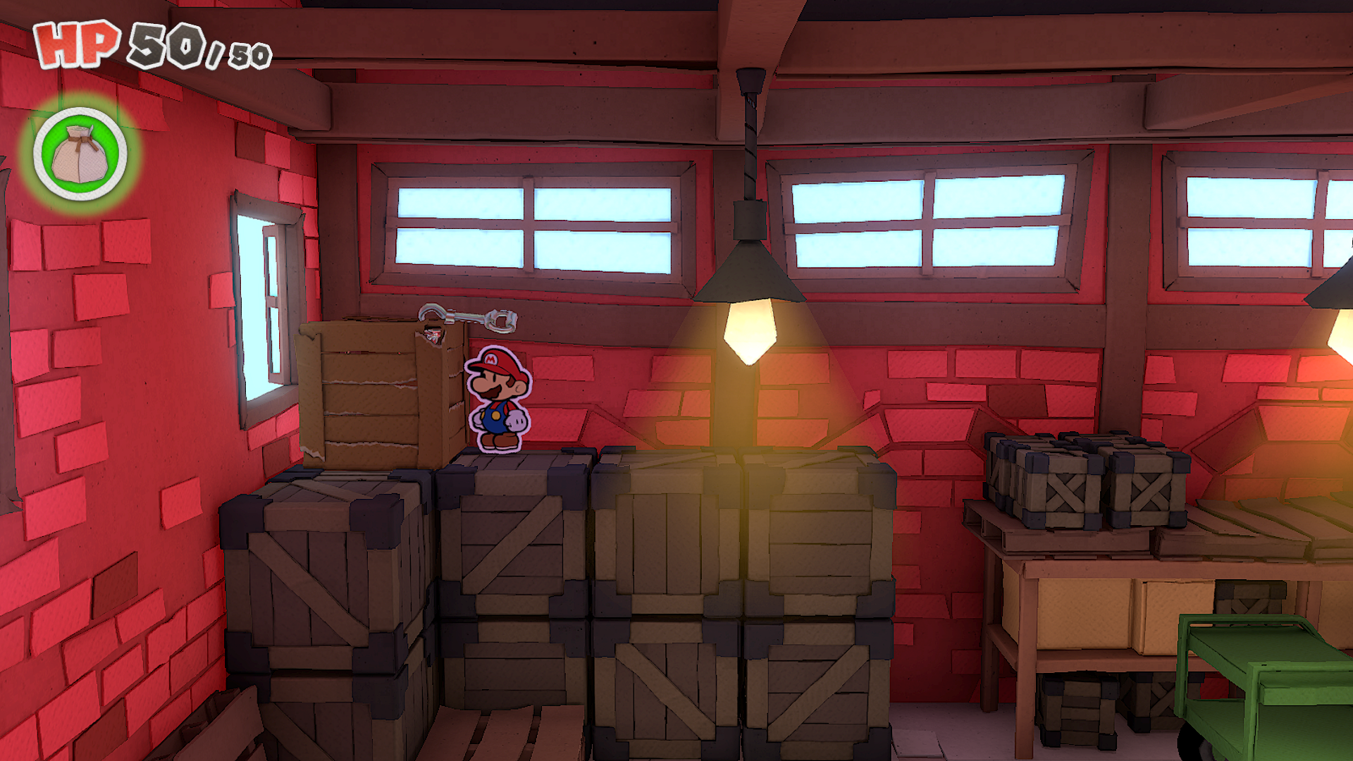 | Description | Mario standing near a crate containing a Mushroom in Toad Town of The Origami King. |