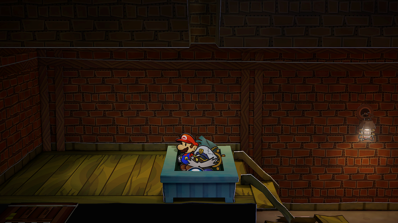 Description | Mario near a Super Mushroom in the garbage bin in Riverside Station of Paper Mario: The Thousand-Year Door for Nintendo Switch. |