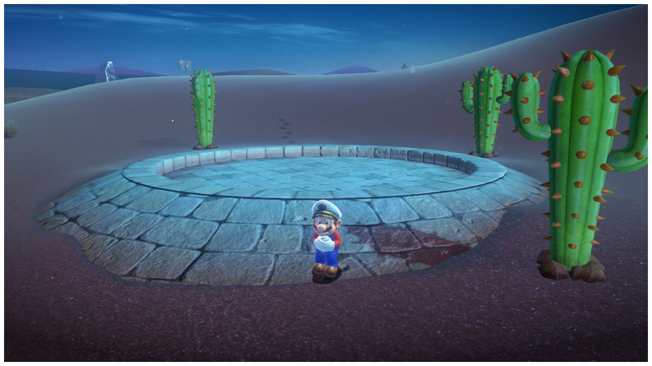 | Description | This screenshot from Super Mario Odyssey shows the platform for Herding Sheep in the Desert... without the Tostarenan who gives it out present. During The Hole in the Desert, they do not appear. |