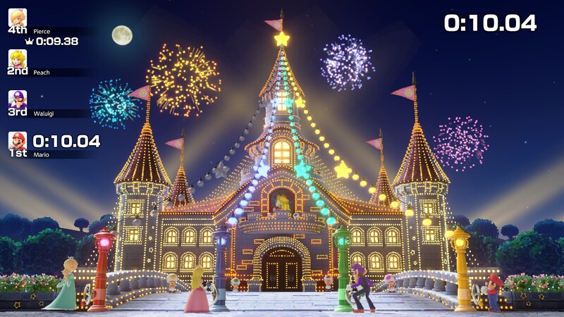 Description | Player 4 lights up the entire Peach's Castle in Night Lights in Super Mario Party Jamboree |