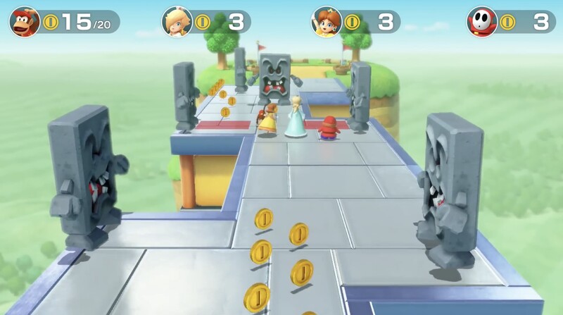 Description | The Follow the Money minigame in Super Mario Party, featuring Whomps. |