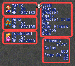 | Description | The pause menu in Super Mario RPG: Legend of the Seven Stars |