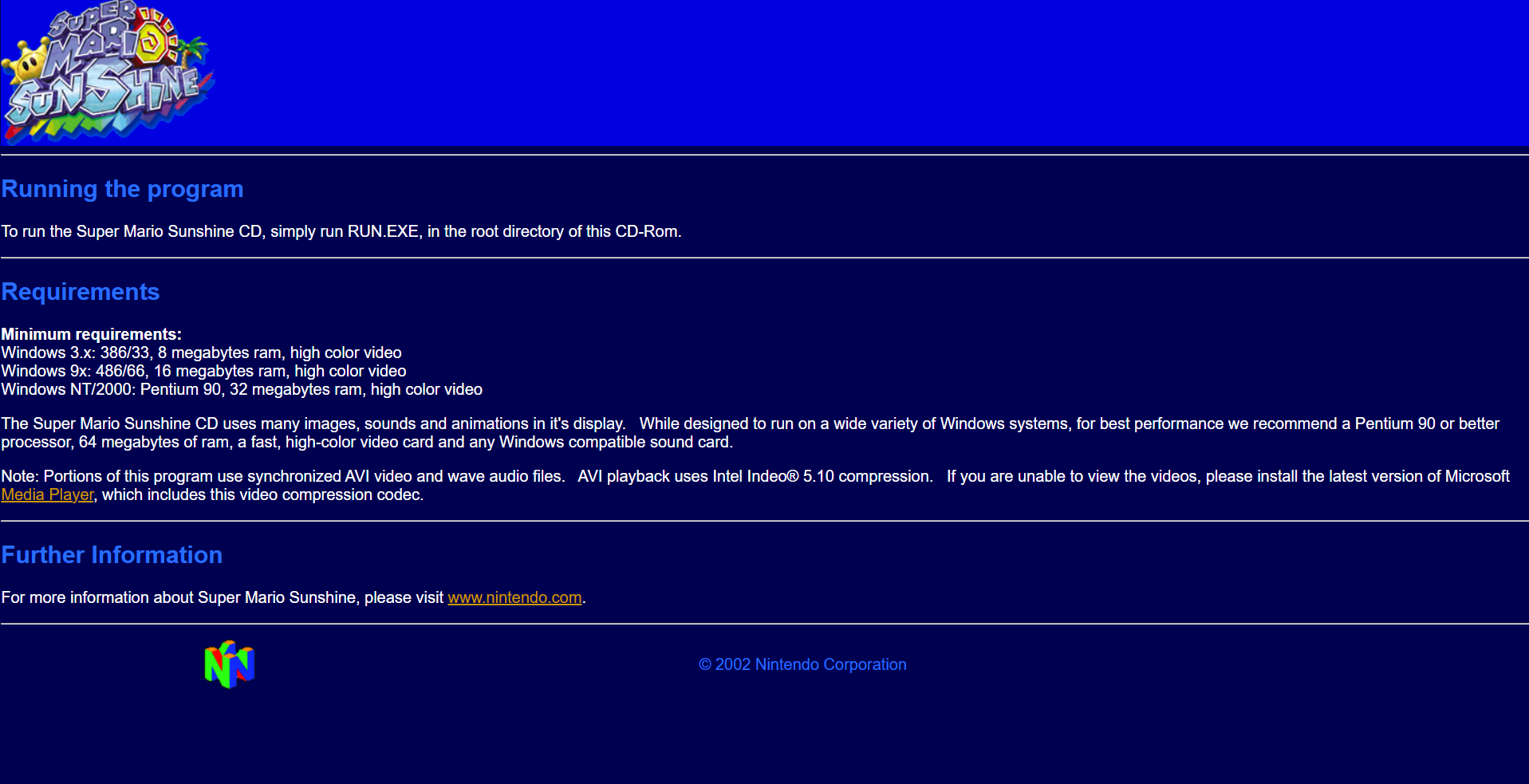 | current | 18:00, November 11, 2025 | 1,917 × 983 (221 KB) | Nelsonic (talk | contribs) | {{aboutfile |1=''Super Mario Sunshine Game Preview CD'' |2=[https://archive.org/details/super-mario-sunshine-game-preview-cd Self-taken from an .HTML file downloaded here] }} Category:Super Mario Sunshine Game Preview CD images |
