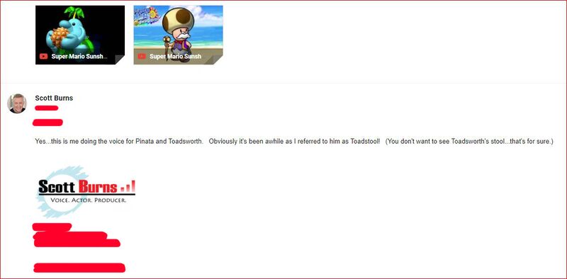 Description | An e-mail from Scott Burns confirming that he voiced the male Piantas and Toadsworth in Super Mario Sunshine. |