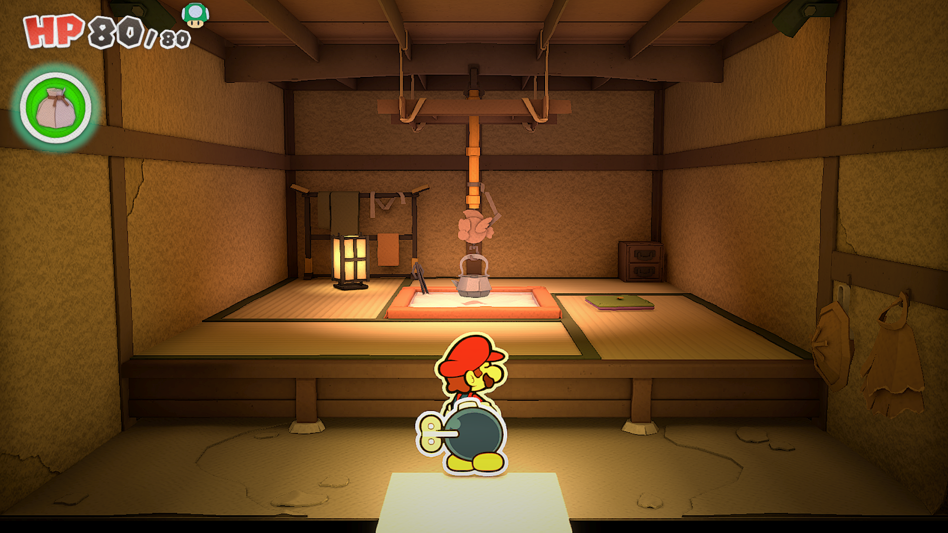 | Description | Mario in a house with coins inside a lantern and a cupboard in Shogun Studios of The Origami King. |