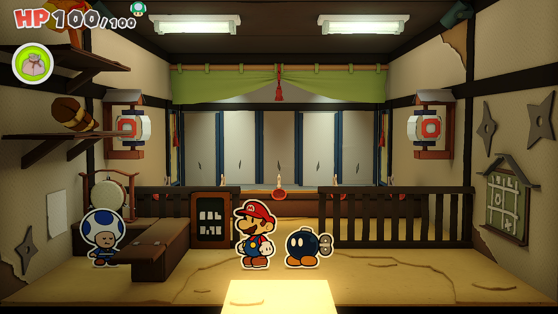 | Description | Mario standing near prizes from the Shuriken Dojo after winning the collectable treasure and the Baseball item in Shogun Studios of The Origami King. |
