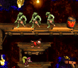 Description | Diddy Kong and Dixie Kong beneath three Klomps and a DK Barrel at the start of Squawks's Shaft |
