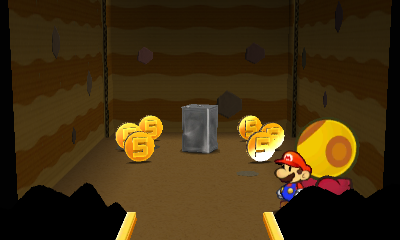 Description | Mario near the Square Can Thing surrounded by 6 Five Coins in Stump Glade of Paper Mario: Sticker Star. |