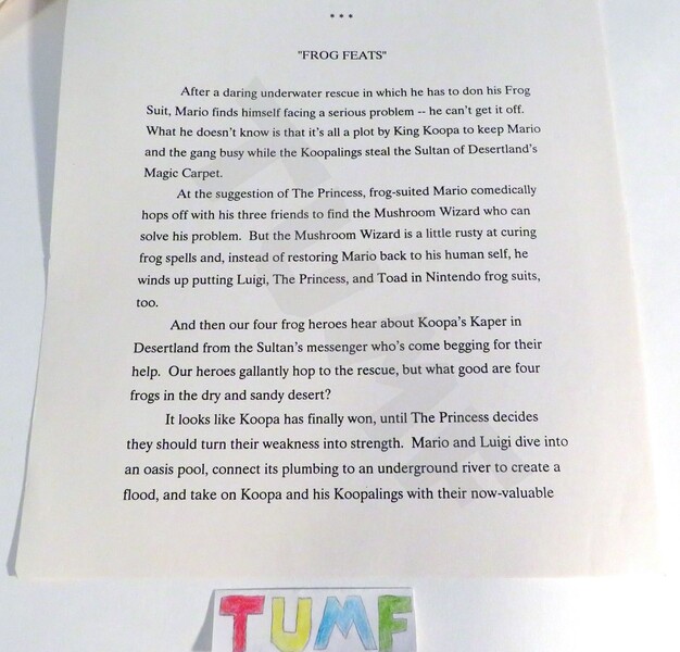 | Source | Cropped from Here's the plot summary for "Frog Feats," an unpublished episode of The Adventures of Super Mario Bros. 3, from the writer's bible. Search "Frog Feats Mario" on Google; you get no results. But with this, the episode is now public at last and we can imagine how it would have been! |