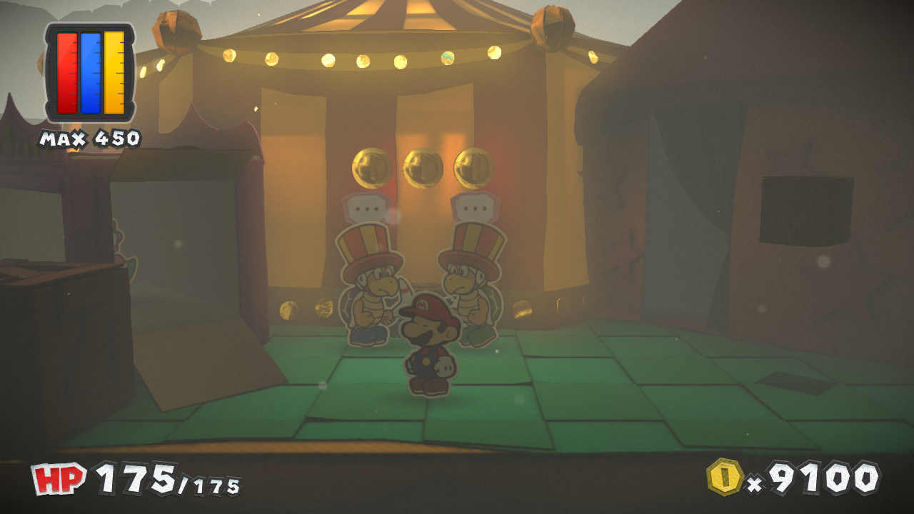 Description | Mario near 3 Coins in The Emerald Circus of Paper Mario: Color Splash. |