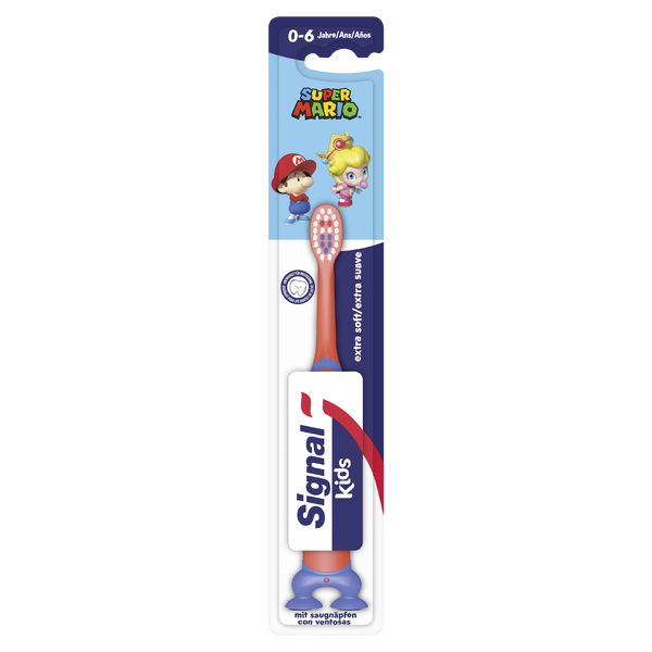 | Description | Signal Kids toothbrush with a color scheme based on Baby Mario. Pictured on the packaging are Baby Mario and Baby Peach. The packaging features text in German, French, and Spanish. |