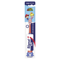 Article description: (description) This attribute controls the content of the description and og:description elements. | Signal Kids toothbrush with a color scheme based on Baby Mario. Pictured on the packaging are Baby Mario and Baby Peach. The packaging features text in German, French, and Spanish. |