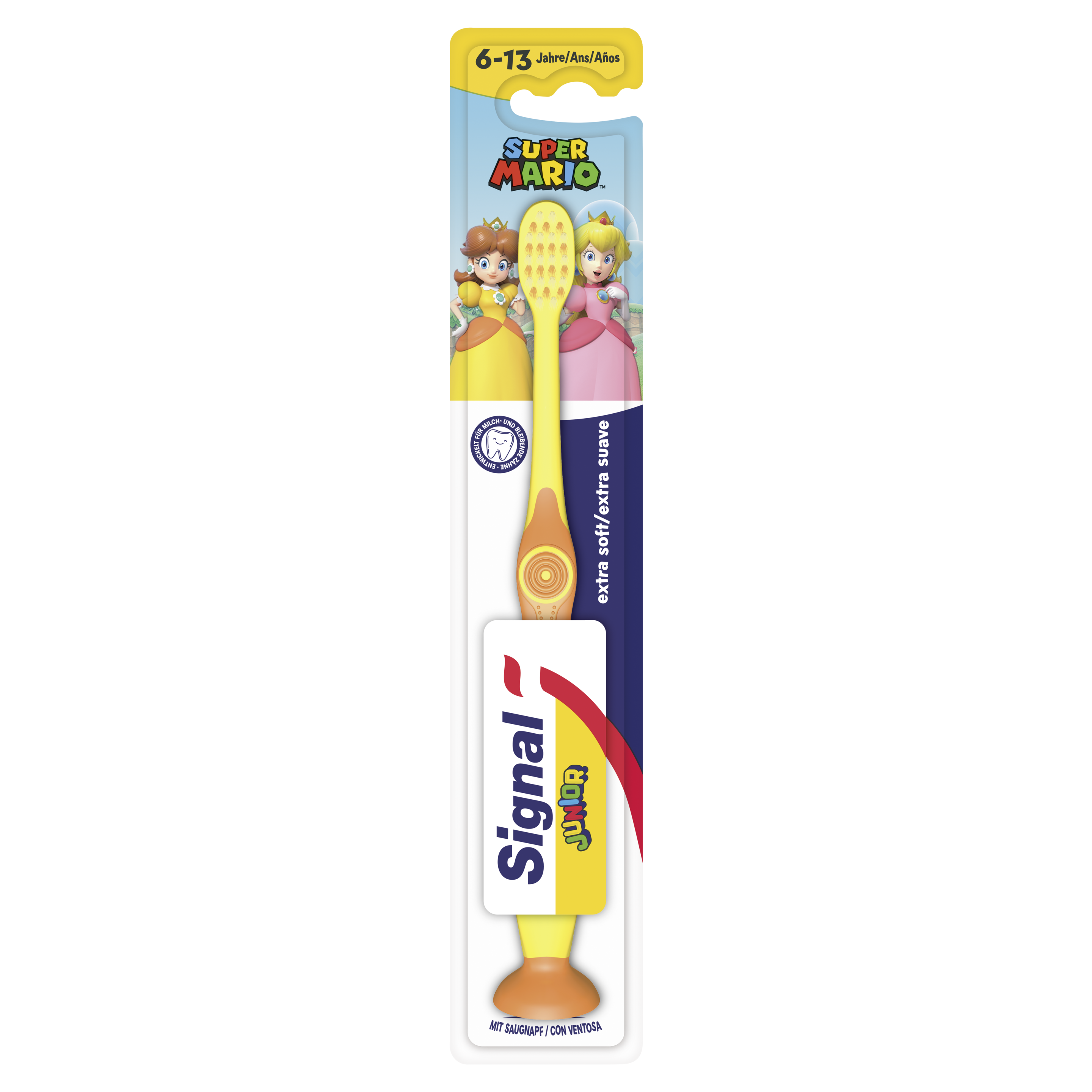 Description | Signal Junior toothbrush with a color scheme based on Daisy. Pictured on the packaging are Daisy and Princess Peach. The packaging features text in German, French, and Spanish. |