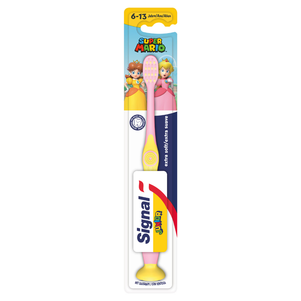 | Description | Signal Junior toothbrush with a color scheme based on Princess Peach. Pictured on the packaging are Daisy and Peach. The packaging features text in German, French, and Spanish. |