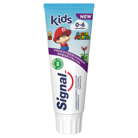 Article description: (description) This attribute controls the content of the description and og:description elements. | Baby Mario–themed tube of fruity-flavored Signal Kids toothpaste. The tube features text in German and Spanish. |